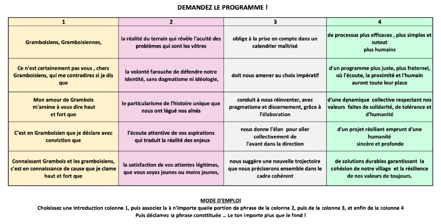 Sans aucun esprit polémique, car il arrive à chacun de la pratiquer, même parfois sans s’en rendre compte, on vous propose un jeu pour vous entrainer à la langue de bois en l’adaptant à notre contexte gramboisien. Exercez-vous, amusez-vous , et n’hésitez pas à reprendre ceux d’entre nous qui abusent de ce langage !